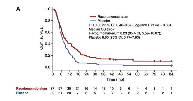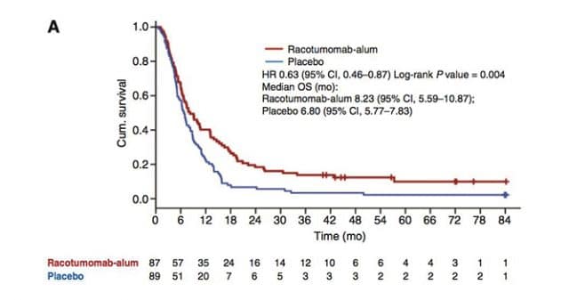 Prof. Dr. Mustafa Benekli: Bu aşılarla ilgili yapılmış 2 adet karşılaştırmalı çalışma bulunmaktadır. Racotumomab çalışmasında aşı yapılan hastaların ortanca yaşam süresi 2 ay kadar uzamaktadır (aşı ile 8.2 aya karşılık aşısız 6.8 ay). Aşının etkin olabileceğini gösteren veri ise 2 yıllık yaşam oranlarıdır. Aşılanan hastaların %18.4’ü, aşı yapılmayan hastaların %6.7’si 2 yıl yaşamaktadır. Uzun dönem yaşam süresindeki bu fark nedeniyle (%11.7) bu aşılara Küba ve Güney Amerika ülkelerinde kullanım izni verilmiştir (Şekil A).