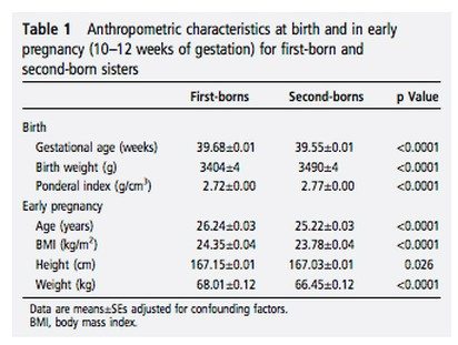 Buna göre; İlk doğan kadınların vücut kitle indeksleri(VKİ), kendisinden sonra doğan kız kardeşlerine göre ortalama % 2,4 daha fazla olduğu bulundu. Başka bir ifadeyle ilk doğan kadınların kendisinden sonra doğan kız kardeşlerine göre % 29 daha şişman oluduğu tespit edildi. (Bu oran aşırı şişmanlarda % 40 kadar ulaşıyor.)