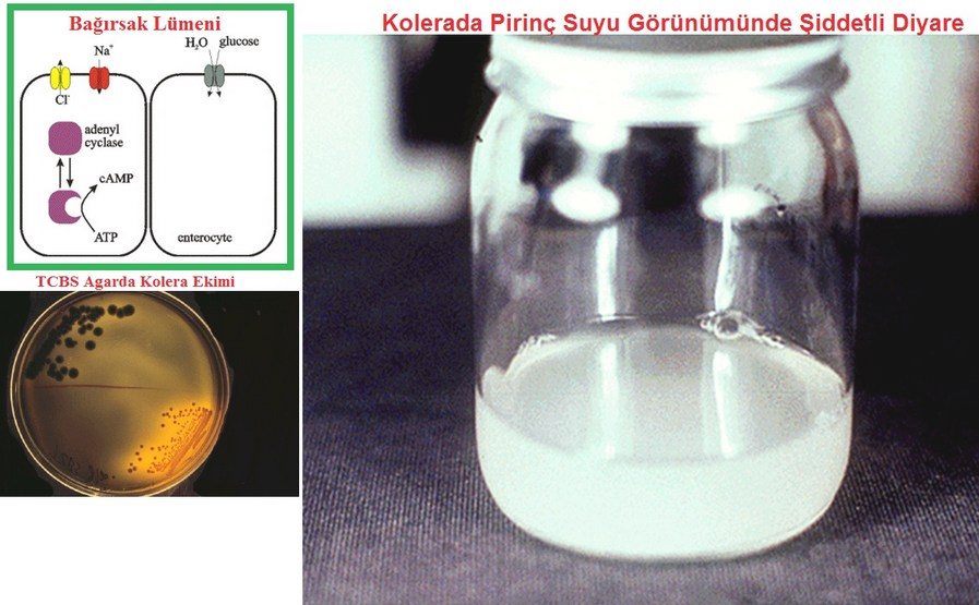 Kolera vibriyonu az miktarda alınırsa hastalık oluşmayabilir. Predispozan faktörler infeksiyonu kolaylaştırır. Bağırsağa geçen bakteri müsinaz enziminin katkısıyla mukoza bariyerini geçer. Enterotoksinin A1 kısmı sekretuvar hücrelerin içine girer. Adenilat siklaz enzimini aktive eder. c-AMP artar. Kript hücrelerinden lümene sıvı ve elektrolit kaybı olur. En fazla sıvı kaybı duodenumdan olur (sekresyon bu bölgede en fazla). Kolondan sıvı kaybı en azdır. İshal pirinç suyu görünümündedir. Na, Cl, HCO3 ve K kaybı olur.