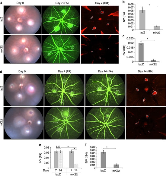Başarılı bir çalışma: CRISPR-Cas9 teknoloji ile VEGFR2 genindeki mutasyonlu kısımı alınarak yerine başarılı bir şekilde genin mutasyonsuz yani sağlıklı formu injete edilildi. Transfer sonrası retina tabakasının altında kan damarlarının anormal çoğalması durdurularak makula dejenerasyonun önüne geçildi.(4)