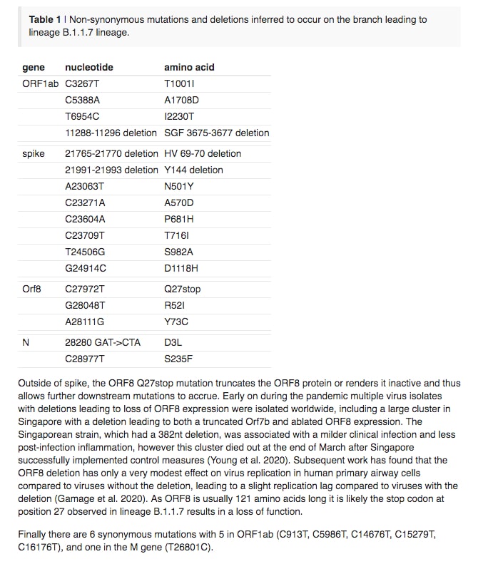 Edinburgh Üniversitesi’nden Andrew Rambaut yeni mutasyon ile ilgili şöyle dedi: “B.1.1.7 hattında normalden daha fazla genetik değişiklik var. Buna göre, yeni SARS-CoV-2, orjinal tipten farklı olarak 3’ü tamamıyla kaybolmuş, 14 hatta ise değişmiş Amino Asitler yer almaktadır.” Andrew Rambaut, 14 hatta amino asit değişikliğinin, Covid-19 küresel genetik envanterindeşimdiye kadar görülmemiş bir durum olduğunu belirtiliyor.