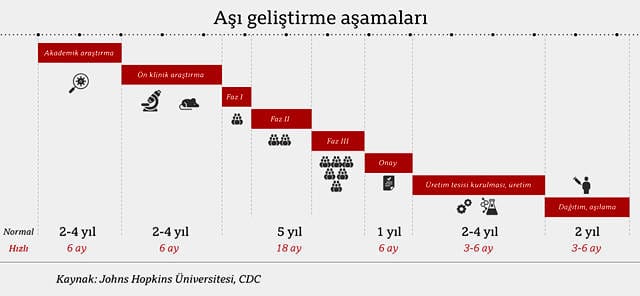 Klinik deneyler ve ardından onay ve üretim aşamaları, en nihayetinde dağıtım ve aşılama aşamaları ile son buluyor. Uzun ve zahmetli olan bu süreç ortalama 10-15 yıl olarak kabul ediliyor. Tarihte daha önce geliştirilen aşılara bakıldığında en hızlı üretilen aşının dört yılda geliştirilen kabakulak aşısı olduğunu görüyoruz.