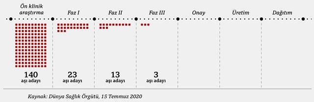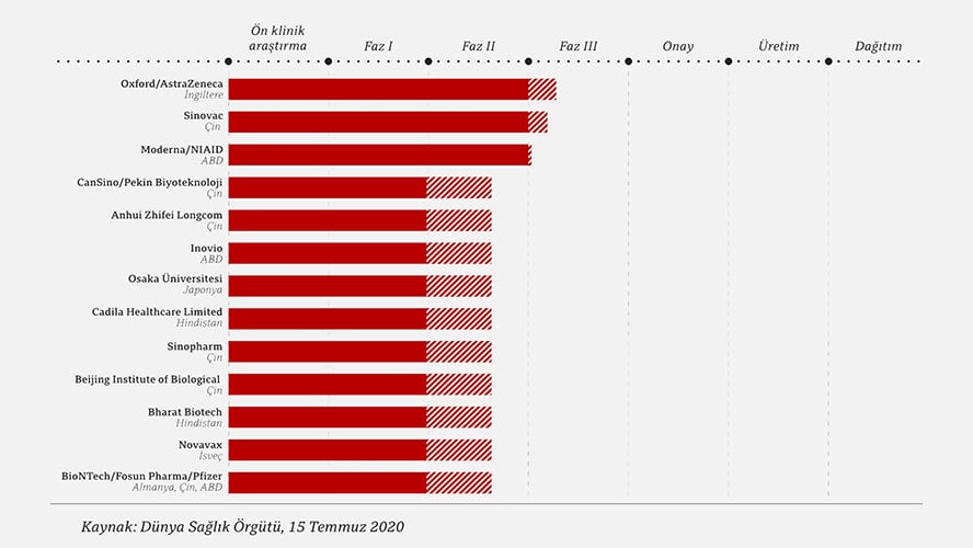 Dünya Sağlık Örgütü (WHO) verilerine göre Covid-19 için 15 Temmuz 2020 tarihi itibariyle aralarında Türkiye’nin de olduğu ondan fazla ülkede toplam 163 aşı çalışması devam ediyor. Bunların 23 tanesi klinik araştırma aşamasını geçti ve insanlar üzerinde deneniyor. Türkiye’den Boğaziçi, Ege, Ankara, Ortadoğu Teknik, 9 Eylül, Selçuk ve Acıbadem üniversiteleri de aşı geliştirme yarışına dahil olan kurumlardan.