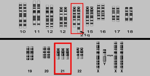 Trisomie 21, Down-Sendromun en sık görülen formu olup her ırk ve toplumda aşağı yukarı eşit oranda görülür. Görülme sıklığı 1:500 ile 1:800 arasındadır. Hücre bölünmesi esnasında meydana gelen bir hata 21. kromozomun iki kopya yerine üç kopyasının yapılmasına sebep olur. Normal sağlıklı insanlarda 46 tek kromozom bulunurken Down Sendromulu (Trizomi 21) hastalarda bölünmede meydana gelen bu hata nedeniyle 21. kromozom 3 adet bulunur.