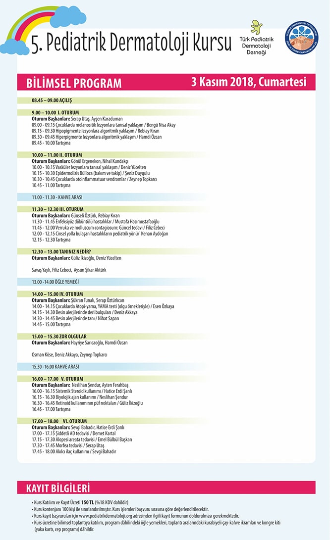 5. Pediatrik Dermatoloji Kursu 3 Kasım`da Yapılacaktır. Başvuru için formu doldurabilirsiniz. Linki tıklayarak başvuru formuna ulaşabilirsiniz. Bilimsel program açıklanmıştır, detaylar için tıklayınız.