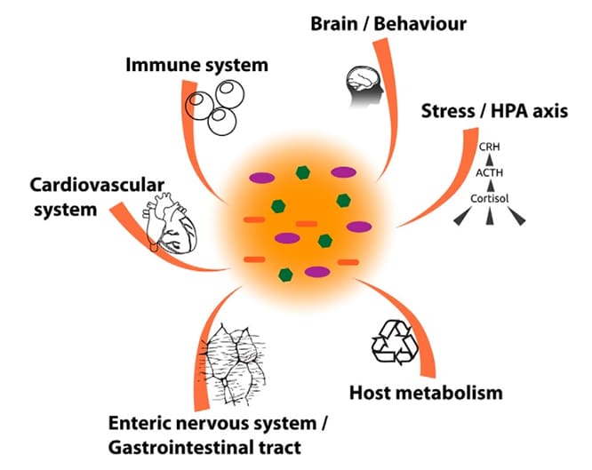 Mikrobiyotadaki değişikliğin nöral fonksiyonları, duygu durumunu, bilişsel fonksiyonları etkilediği hayvan deneyleri ile de kanıtlanmıştır. Doğum sonrası hızlıca intestinalmikrobiyatanın oluşması, birçok immün ve metobolik sistemin oluşması ile bütünleyici sağlığı ve iyilik halini oluşturur. Son yıllarda ki çalışmalar, gut mikrobiyotanın hipotalamik-pitüiter-adrenal aks’ın aktivitesini yönettiğini göstermektedir.