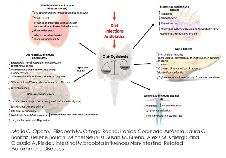 Diyet, enfeksiyon veya antibiyotiklerin aşırı kullanımı gibi dışetkenlerin neden olduğu gut dysbiosis (bağırsak dengesinin bozulması), Grave hastalığı, Hashimoto Tiroiditi, Multipl Skleroz, SLE ve tip 1 diyabet gibi birçok otoimmün hastalığı tetikleyebilir. Ayrıca deriyle ilişkili otoimmün hastalıklarda Psoriasis (sedef hastalığı) için de önemli bir rolü olduğu gözlenmiştir. Dahası, literatürdeki kanıtlar bağırsak mikrobiyotasının otizm, depresyon ve şizofreni gibi merkezi sinir sistemi bozukluklarını etkileyebileceğini desteklemektedir.