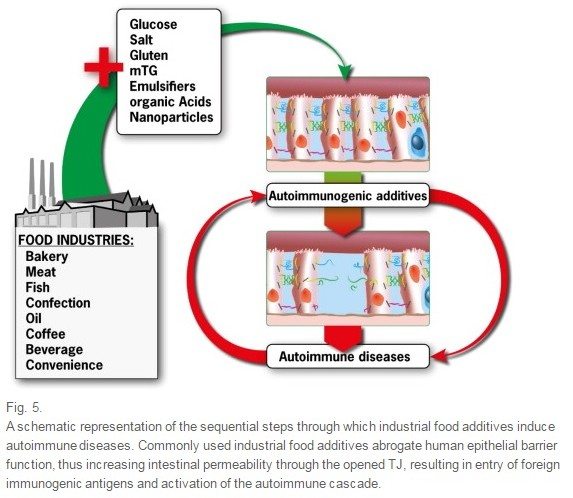Alman ve İsralli bilim insanlarının ortaklaşa yapmış olduğu ve 9 Şubat 2015 tarihinde Autoimmunity Reviews dergisinde yayınladıkları bir araştırmada, gıda maddelerinde kullanılan tat ve raf ömrünü uzatmaya yönelik suni katkı maddelerin örneğin glikoz(şeker) , sodyum (tuz), emülsiyon yapıcılar, organik asitler, glüten ve mikrobik enzimlerin bağırsaklarda bulunan ve vücuttaki bağışıklık dengesini düzenleyen “Tight junctions” kanallarının çalışmasını olumsuz etkilediğini buldular. Konuyla ilgili açıklama yapan Prof. Aaron Lerner “tight junctions” kanallarındaki bu değişikliğn Multiple Sklerose sebep olabileceğini belirtiliyor. [11]