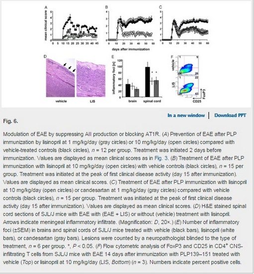 ACE- inhibitörleri, sinir hücrelerindeki iltihaplanmayı teşvik eden spesifik immün habercileri baskılayarak sinirlerin iltihaplanmasını önlediği ve sinir hücrelerinde geriye dönük bir iyileşmenin olduğu görüldü. [1] California’daki Stanford Üniversitesi’nden Lawrence Steinman’ın 2009’da yapmış olduğu araştırma da benzer sonuçlar verdi.[2]