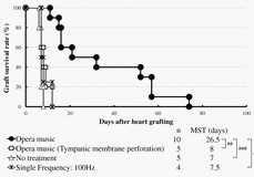 Methods: Naïve CBA mice (H2k) underwent transplantation of a C57BL/6 (B6, H2b) heart and were exposed to one of three types of music–opera (La Traviata), classical (Mozart), and New Age (Enya)–or one of six different single sound frequencies, for 7 days. Additionally, we prepared two groups of CBA recipients with tympanic membrane perforation exposed to opera for 7 days and CBA recipients exposed to opera for 7 days before transplantation (pre-treatment). An adoptive transfer study was performed to determine whether regulatory cells were generated in allograft recipients. Immunohistochemical, cell-proliferation, cytokine, and flow cytometry assessments were also performed.