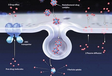 Resim: Nanoelmaslar ve meme kanseri. Kemoterapi ilacı epirubisine bağlanmış olan nanoelmaslar bir lipit membranla çevrelenmiştir ve tedavisi zor tümörlere spesifik antikorlar ile eşleştirilmiştir. Bu hibrid ilaç ulaştırma ajanları tümörlerin boyutunda küçülmeye neden olurken, ilaç toleransını belirgin olarak iyileştirmektedir.