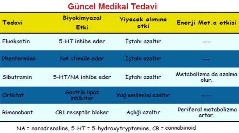 Medikal tedavi: BKI 30 olanlar ve BKI 27 olup, beraberinde HT, dislipidemi, KAH, tip 2 DM, uyku apnesi gibi risk faktörleri veya hastalıkları olanlara verilir. İdeal bir obezite ilacı: dozla ilişkili kilo kaybı yapmalı, ulaşılan hedef kilonun devamlılığını sağlamalı, kronik olarak kullanıldığında da guvenilir olmalı, tolerans gelişmemeli ve kötü kullanım ya da bağımlılık yapmamalıdır. Ne yazık ki böyle bir ilaç (en azından günümüzde) yoktur.