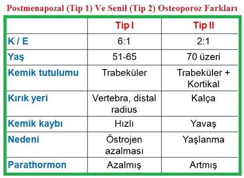 Osteoporoz sınıflandırılması: A-Primer osteoporoz: 1-İdiyopatik OP. 2-İnvolüsyonel OP; postmenapozal OP (tip 1), senil OP (tip 2). B-sekonder osteoporoz: endokrin nedenler, malign nedenler, romatoid artrit gibi rom hastalıkları, kronik nörolojik hastalıklar, ilaçlar, kollajen sentez bozuklukları, hepatik ve gastroentestinal nedenler, beslenme, immobilizasyon.