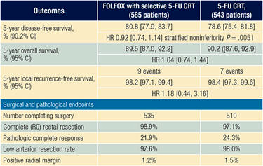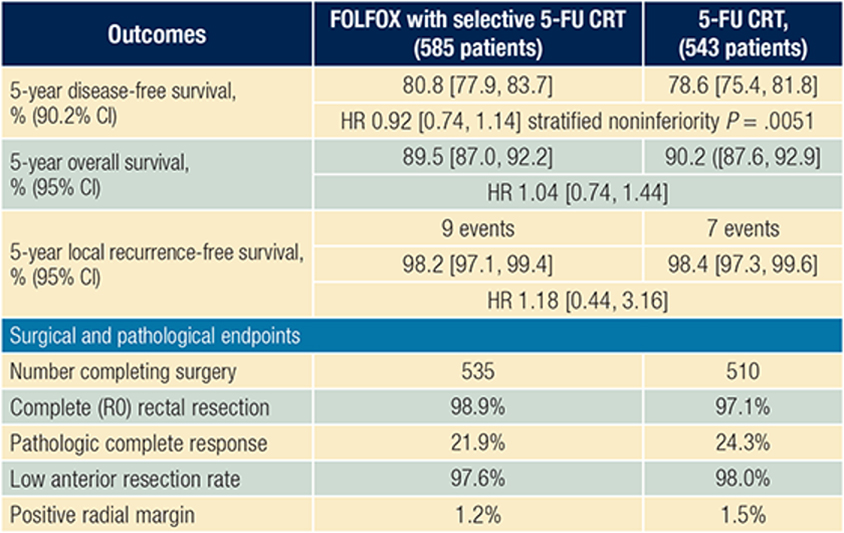 Araştırma grubunda tedavi gören hastaların %80.8’i 5 yıl hastalıksız yaşam oranına ulaştı. Bu oran standart tedavi alan hastalarda %78.6 olarak gerçekleşti. Her iki grup arasında önemli bir fark olmadığı gözlendi. 5 yıl boyunca genel sağkalım (OS) oranları FOLFOX grubunda %89.5 ve standart tedavi grubunda %90.2 olarak bulundu. Lokal nüks oranları da benzerdi ve her iki grupta da %98’den fazla hastada bu süre zarfında lokal nüks saptanmadı.