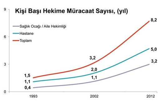 Yıllık bazda en son verilere göre; 2011 sonunda yaklaşık 75 milyon nüfusumuz var, 244 milyon muayene gerçekleştirmişiz. Birinci basamakta hekim sayımız 23 bini biraz geçmiş. Birinci basamak sağlık hizmet kuruluşlarında yapılan muayenelerin toplam muayeneye oranı 2002’de %36 seviyesindeyken, 2011’de bu oran % 40’a çıkmış.
