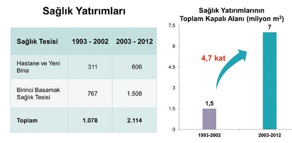Bununla birlikte yeni yapacaklarımız da var. Bunların en önemlilerinden biri ülkemizin önümüzdeki 30 yıl için sağlık ihtiyaçlarını tamamen karşılayacak hastane yatırımlarımız. Bunlar son derece konforlu, çalışan ve hizmet alanlar için çağdaş mekanlar olacak. Buna paralel sağlık hizmet planlamalarımızı tamamlıyoruz. Mesela; bir kalp krizi durumunda vatandaşlarımız yurdun hangi köşesinde olursa olsun saatler içinde kalp müdahalesinin yapılabileceği bir hastaneye ulaştırılacak. Bu ancak çağdaş dünyanın bazı küçük coğrafyalı ülkelerinde ulaşılabilen bir standarda ulaşmak anlamına geliyor.
