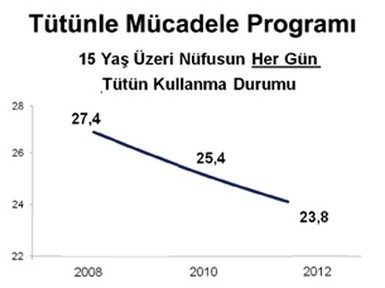 Sigarayla mücadele için kampanyalar başlattık, paket üzeri uyarıcı yazı ve resimleri uygulamaya koyduk, reklamları yasakladık. Sigara görüntüsünün televizyonlarda kullanımını yasaklayan tek ülke de biziz. Ayrıca, sigaranın her türlü reklamı ya da dolaylı yollardan kullanımının özendirilmesine yönelik mücadele verdik. Satış yerlerindeki reklam imkânlarını da engelledik. Hükümetimizin, Maliye Bakanlığımızın da desteğiyle, DSÖ tarafından en az %75 olarak önerilen sigaradaki vergi oranını %80’e kadar yükselttik.