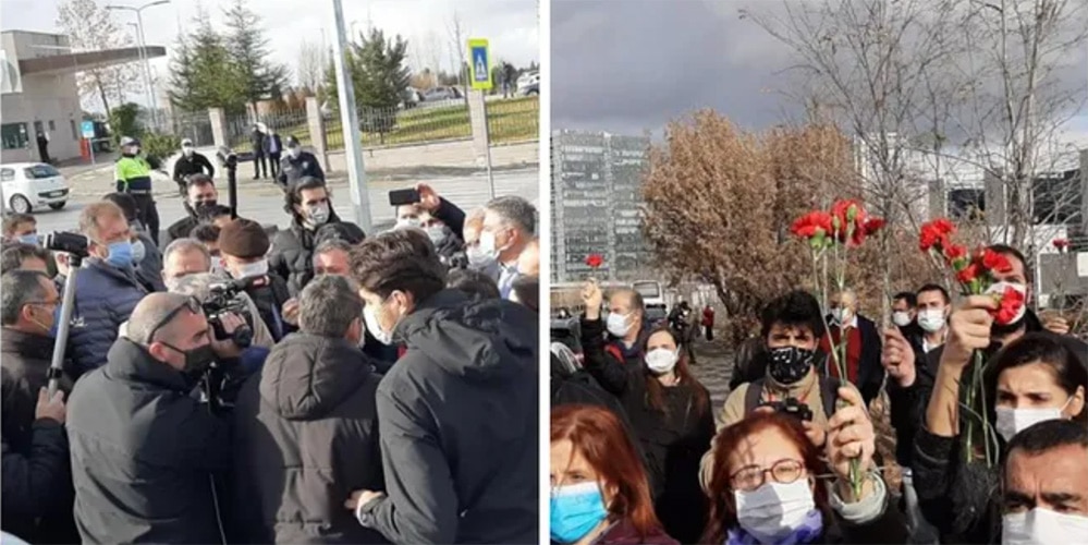 Bakanlık önünde bir dakikalık saygı duruşunda bulunduktan sonra öncelikli taleplerini içeren dilekçeleri bakanlık yetkililerine sunmak isteyen sağlık çalışanlarına polis engel olmak istedi. Ankara Tabip Odası, söz konusu engelleme girişimini “Ankara sağlık meslek ve emek örgütleri olarak yapmak istediğimiz anma polis tarafından engelleniyor” sözleriyle duyurdu.