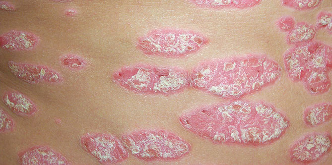 Vücudun herhangi bir yerinde belirebilecek olan yamalara genellikle dizlerde, dirseklerde, bacaklarda, kafa derisinde, avuç içlerinde, bel çevresinde ve ayak tabanlarında rastlanır. Bu yamalar bazen el ve ayak tırnaklarında, ağız içinde ve genital bölgede de belirebilir. Hastalık belirli bir süre için kötüleşebilir ardından iyileşme devresine girer.
