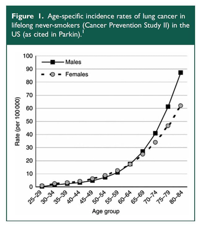 Hiç sigara içmemiş kişilerde görülen akciğer kanseri genellikle küçük hücreli dışı akciğer kanseridir. Küçük hücreli akciğer kanseri sigara içenlerde oldukça fazla görülürken, hiç sigara içmemiş kişilerde oldukça nadir görülür. 1,2 milyon Amerikalının katıldığı prospektif, kohort Kanser Koruma Çalışması II’de 30 yıl takip edilen hastalar, hiç sigara içmemiş kişilerde akciğer kanserinin yaş ile insidansının arttığı tespit edilmiştir.(fig 1)