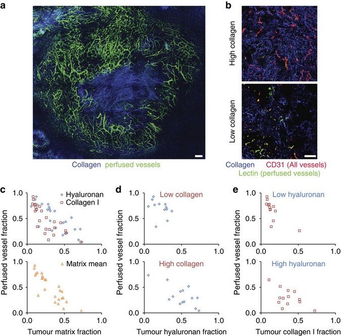 Cancer and stromal cells actively exert physical forces (solid stress) to compress tumour blood vessels, thus reducing vascular perfusion. Tumour interstitial matrix also contributes to solid stress, with hyaluronan implicated as the primary matrix molecule responsible for vessel compression because of its swelling behaviour. Here we show, unexpectedly, that hyaluronan compresses vessels only in collagen-rich tumours, suggesting that collagen and hyaluronan together are critical targets for decompressing tumour vessels. We demonstrate that the angiotensin inhibitor losartan reduces stromal collagen and hyaluronan production, associated with decreased expression of profibrotic signals TGF-β1, CCN2 and ET-1, downstream of angiotensin-II-receptor-1 inhibition.