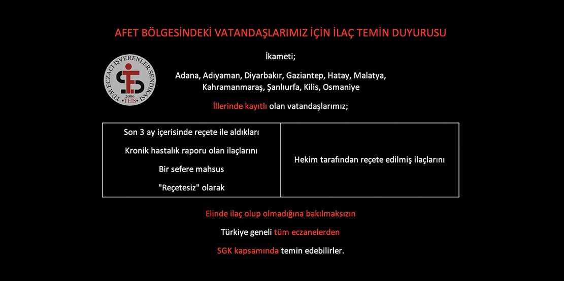 Çalışma ve Sosyal Güvenlik Bakanlığı, deprem bölgesinde raporlu ilaç ve sürekli kullanılan tıbbi malzemelerin bir defaya mahsus olmak üzere reçetesiz alınabileceğini duyurdu. Bu kapsamda alınan ilaçlardan yine bir defaya mahsus olmak üzere katkı payı da alınmayacak. Tüm Eczacı İşverenler Sendikası da (TEİS) yazılı bir açıklama yaparak, deprem bölgesinde vatandaşların ilaçlarının yıkık binalarda kalması, bazı binalara giriş izni verilmemesi gibi nedenlerle ilaçlara erişim sağlanamadığı için SGK’dan çözüm talep ettiğini duyurmuştu. TEİS, MEDULA sisteminin yeni kararlar doğrultusunda ayarlandığını da açıkladı.