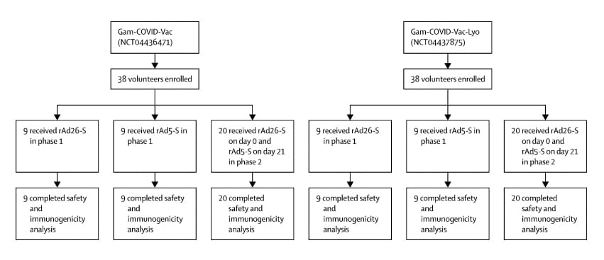 Sputnik V aşısı rekombinant adenovirüs tip 26 (rAd26) vektörü ve bir rekombinant adenovirüs tip 5 (rAd5) vektöründen oluşuyor. Araştırma kapsamında aşının iki formülünün güvenliğini ve immünojenisitesi değerlendiriliyor. Bu amaçla Rusya’daki iki hastanede iki açık, randomize olmayan faz 1/2 çalışması yapılmış. Her iki çalışmaya da 18-60 yaşları arasındaki sağlıklı yetişkinler alınıyor. Her çalışmanın 1. fazında, bir doz rAd26-S veya bir doz rAd5-S uygulandıktan 28 gün sonra güvenliği değerlendiriliyor. 18 Haziran – 3 Ağustos 2020 tarihleri arasında iki çalışmaya 76 katılımcı alınıyor.