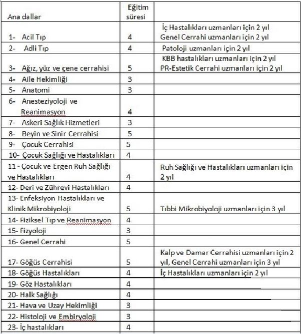 Tıpta uzmanlık ana dallar ve eğitim süreleri çizelgesi