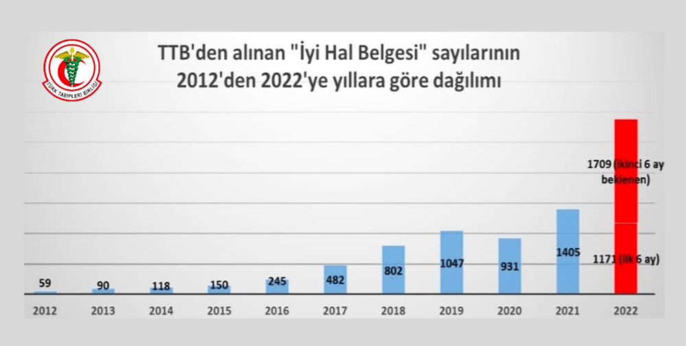 TTB, sağlık çalışanlarının yurt dışında çalışabilmesi için ‘iyi hal belgesi’ aylık başvuru sayısının 2022’nin ilk altı ayında 1171 olduğunu duyurdu. TTB’nin açıklamasına göre, Haziran ayında 229 hekim ‘iyi hal belgesi’ için başvurdu. TTB, 2022’nin ikinci yarısında 1709 hekimin daha başvurusunun beklendiğini kaydetti. Twitter’dan yapılan paylaşımda, “Yetişmiş hekimler; yoksullaşma, ağır çalışma koşulları ve sağlıkta şiddetin baskısı nedeniyle yurtdışına göçüyor. Toplumun sağlık hakkı için oyalama değil, hakkımız olanı istiyoruz” denildi.