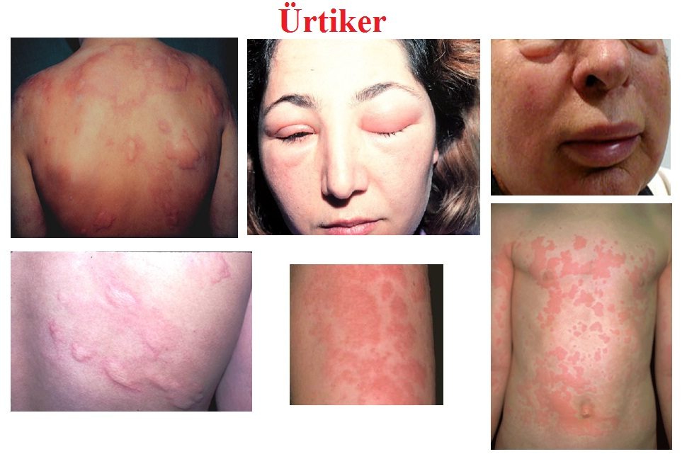 Değişik çaplarda çevresi eritemli-ödemli papül ve plaklar, eşlik eden kaşıntı-bazen yanma hissi vardır. Aniden başlayıp kaybolması önemlidir = 1-24-48 saat içinde.