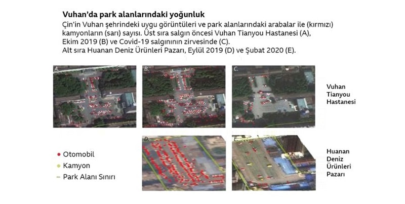 Uzmanlar 2019 Ağustos ve Aralık ayları arasında Vuhan’daki beş hastanenin civarındaki trafik hareketliliğini gösteren ticari uydu görüntülerini incelediler ve bunları 2018 yılının aynı dönemindeki görüntülerle karşılaştırdılar. Örneğin 2018 yılının Ekim ayında Vuhan’ın en büyük hastanelerinden biri olan Tianyou’nun önünde 171 araç park edilmişken, 2019 yılının aynı tarihinde bu sayının 285’e çıktığını gördüler. Bu, araç sayısında yüzde 67’lik bir artışa tekabül ediyor.