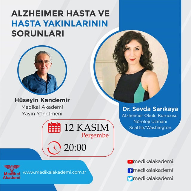Medikal Akademi Güncel Sağlık Söyleşimizin bu haftaki konuğu Alzheimer Okulu Kurucusu, Nöroloji Uzmanı Dr. Sevda Sarıkaya idi. Halen çalışmalarına Seattle/Washington’da sürdüren Dr. Sevda Sarıkaya, Alzheimer ile ilgili yapmakta olduğu çalışmalarla biliniyor. Kendisi ile başta Alzheimer hasta ve hasta yakınlarının sorunları olmak üzere pek çok konuyu konuştuk.