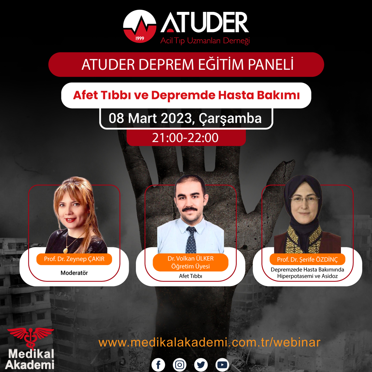 Deprem nedeniyle Medikal Akademi olarak düzenlediğimiz canlı yayın serisinde bu hafta Acil Tıp Uzmanları Derneği ile Deprem Eğitim Paneli‘nde buluşuyoruz. Başta Afet Tıbbı ve Depremde Hasta Bakımı olmak üzere deprem bölgesinde en çok sorulan konuları uzamanları konuşacağız. Oturumun moderatörlüğünü Prof. Dr. Zeynep ÇAKIR, yaptı. Öğretim Üyesi Dr. Volkan ÜLKER, Afet Tıbbı, Prof. Dr. Şerife ÖZDİNÇ, ise Depremzede Hasta Bakımında Hiperpotasemi ve Asidoz, konusunda birer sunum yaptılar. Youtube kanalımıza abone olarak sonraki webinar ve canlı yayınlarımızdan haberdar olabilirsiniz.