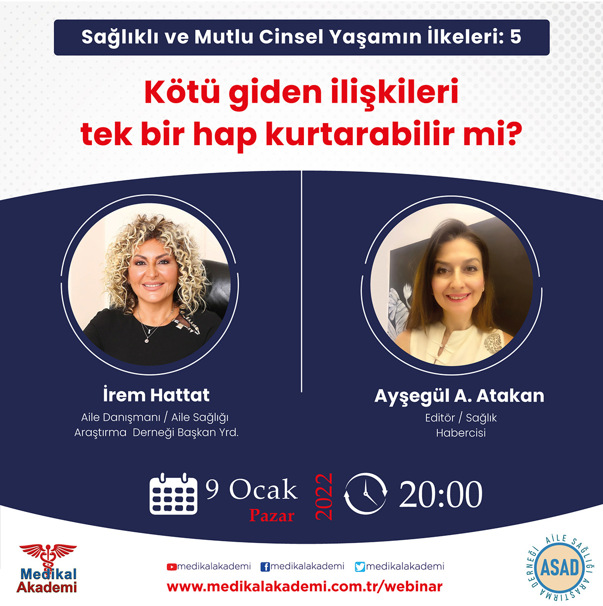 Aile Sağlığı Araştırma Derneği ile işbirliği içinde hazırladığımız ‘Sağlıklı ve Mutlu Cinsel Yaşamın İlkeleri’ söyleşilerimizin 5. oturumunda ‘Kötü giden ilişkileri tek bir hap kurtarabilir mi?’ konusunu Aile Sağlığı Araştırma Derneği Başkan Yardımcısı İrem Hattat ile konuştuk. Oturumun moderatörlüğünüSağlık Habercisi Ayşegül Aydoğan Atakan yaptı. Youtube kanalımıza abone olarak sonraki webinar ve canlı yayınlarımızdan haberdar olabilirsiniz.