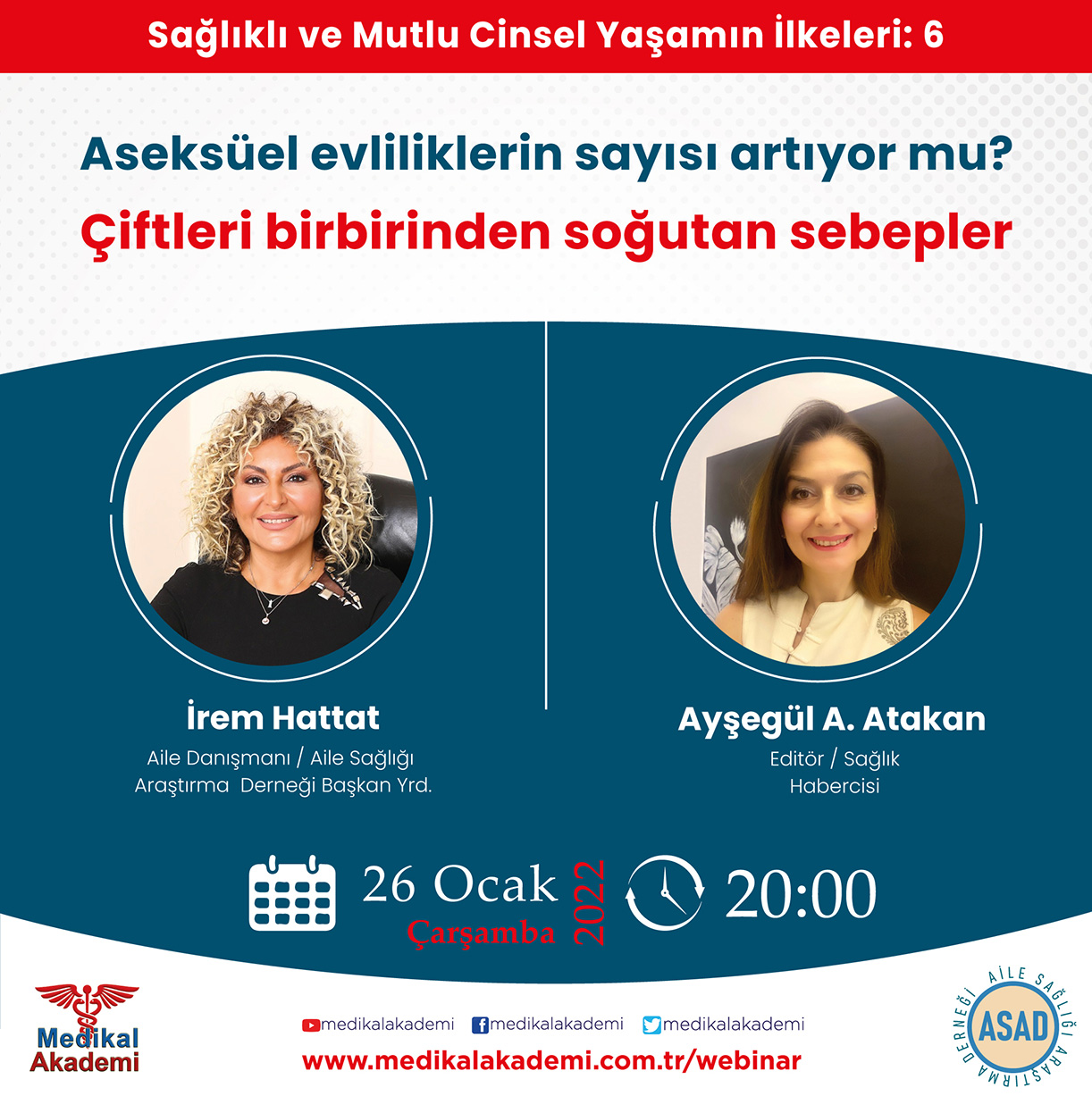 Aile Sağlığı Araştırma Derneği ile işbirliği içinde hazırladığımız ‘Sağlıklı ve Mutlu Cinsel Yaşamın İlkeleri’ söyleşilerimizin 6. oturumunda ‘Aseksüel evliliklerin sayısı artıyor mu? Çiftleri birbirinden soğutan sebepler’ konusunu Aile Sağlığı Araştırma Derneği Başkan Yardımcısı İrem Hattat ile konuştuk. Oturumun moderatörlüğünüSağlık Habercisi Ayşegül Aydoğan Atakan yaptı. Youtube kanalımıza abone olarak sonraki webinar ve canlı yayınlarımızdan haberdar olabilirsiniz.