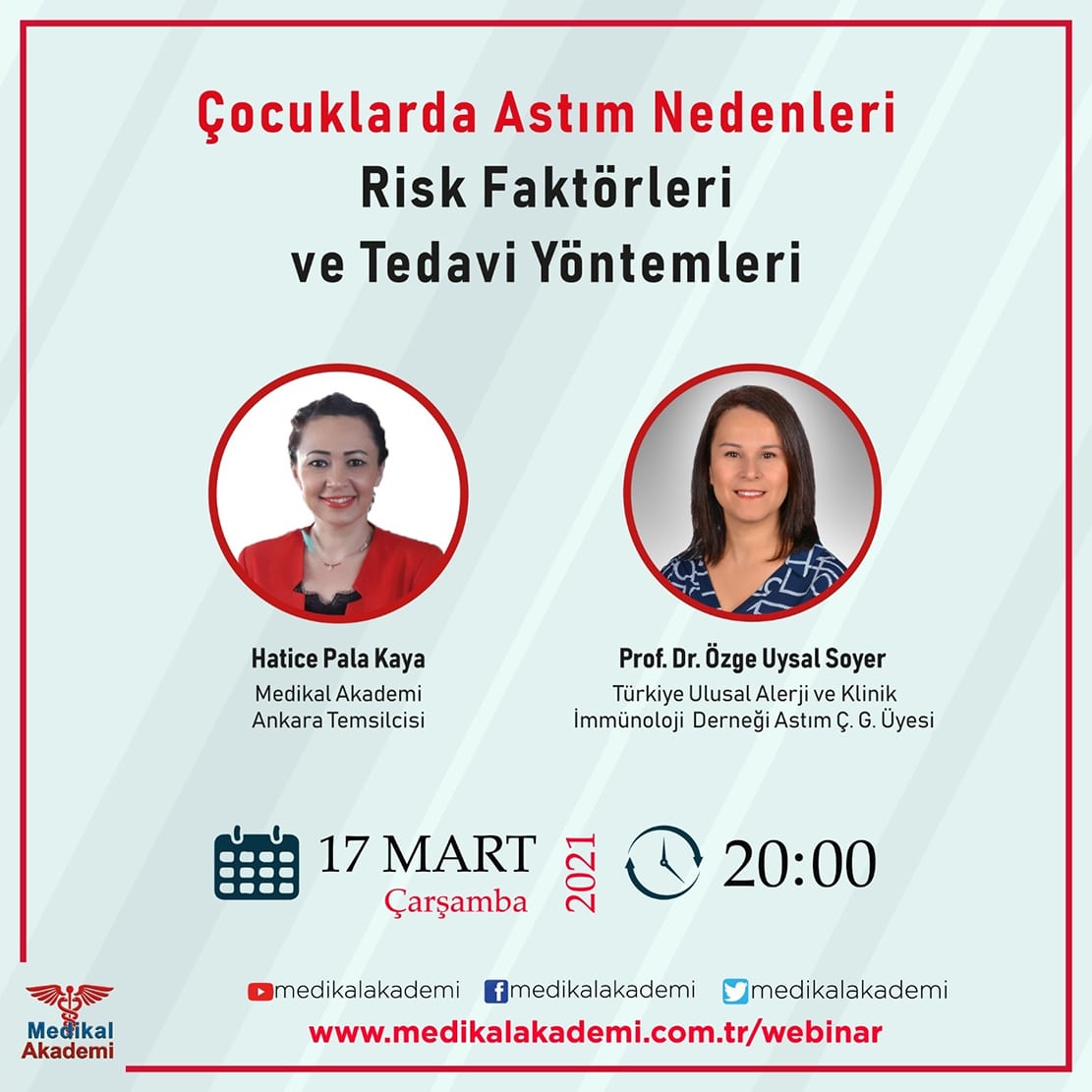 Medikal Akademi Güncel Sağlık Söyleşilerimizin yeni bölümünde “Çocuklarda Astım Nedenleri, Risk Faktörleri ve Tedavi Yöntemleri” konusunda Türkiye Ulusal Alerji ve Klinik İmmünoloji Derneği Astım Çalışma Grubu Üyesi Prof. Dr. Özge Uysal Soyer, Medikal Akademi Ankara Temsilcisi Hatice Pala Kaya‘nın sorularını yanıtlayacak. Yayınımızın sonunda izleyici sorularına da yer verilecektir.