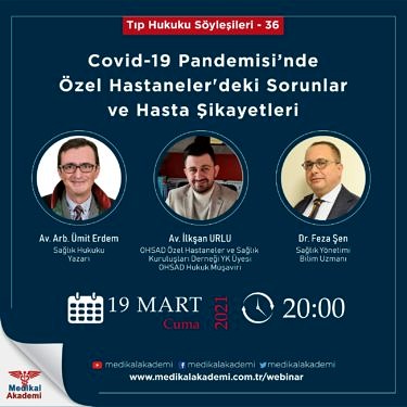 Medikal Akademi Tıp Hukuku Söyleşimizin 36’ıncısnda “Covid-19 Pandemisinde Özel Hastaneler’deki Sorunlar ve Hasta Şikayetleri” konusunu, OHSAD Özel Hastaneler ve Sağlık Kuruluşları Derneği YK Üyesi & OHSAD Hukuk Müşaviri Av. İlkşan URLU ve Sağlık Hukuku Yazarı Av. Arb. Ümit Erdem ile Dr. Feza Şen moderatörlüğünde konuştuk. Youtube kanalımıza abone olarak sonraki etkinliklerden haberdar olabilirsiniz.