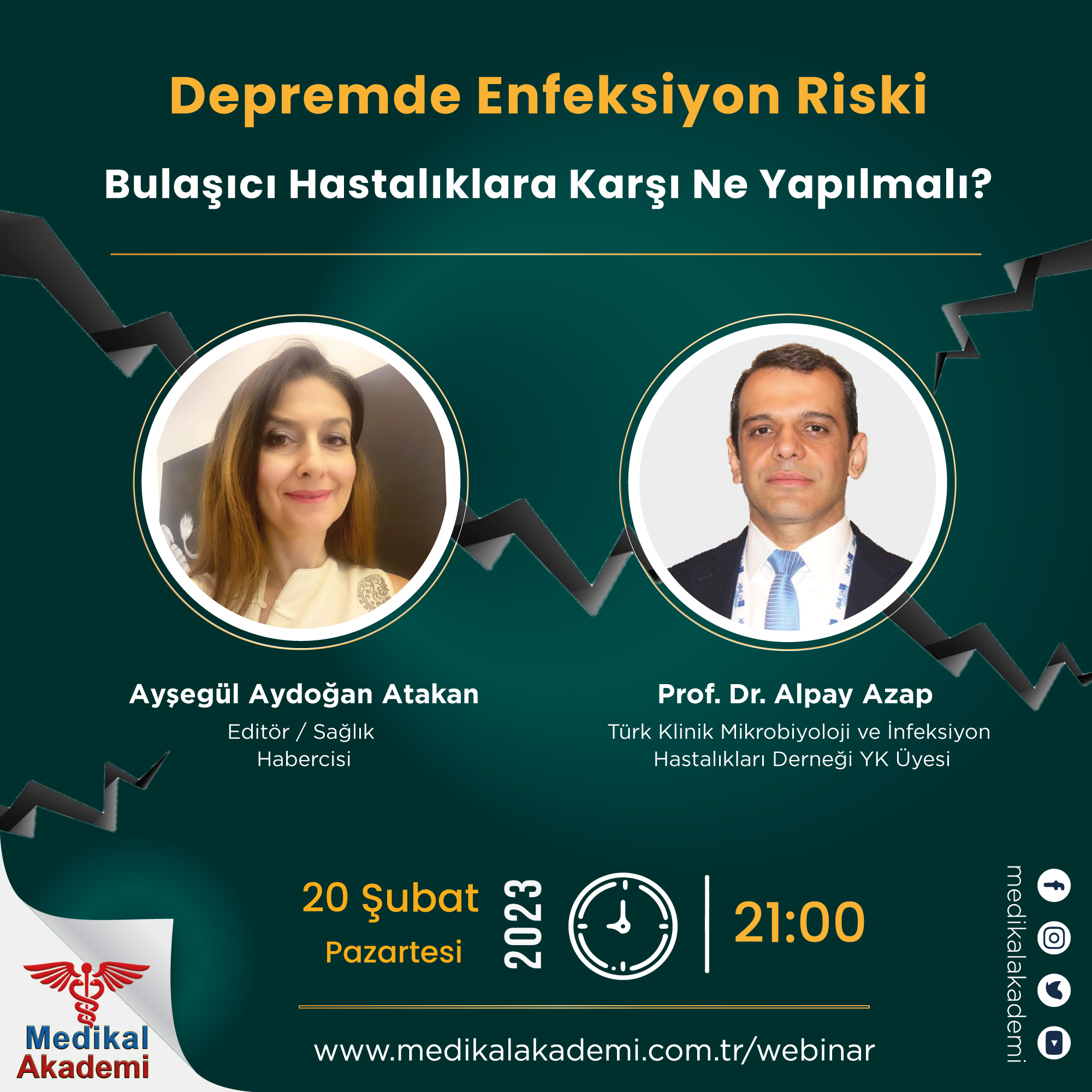 Deprem nedeniyle düzenlediğimiz canlı yayın serisinin yeni bölümünde ‘Depremde Enfeksiyon Riski: Bulaşıcı Hastalıklara Karşı Ne Yapılmalı?’ konusunu Türk Klinik Mikrobiyoloji ve İnfeksiyon Hastalıkları Derneği YK Üyesi Prof. Dr. Alpay Azap, Sağlık Habercisi Ayşegül Aydoğan Atakan‘ın sorularını yanıtladı. Youtube kanalımıza abone olarak sonraki webinar ve canlı yayınlarımızdan haberdar olabilirsiniz.