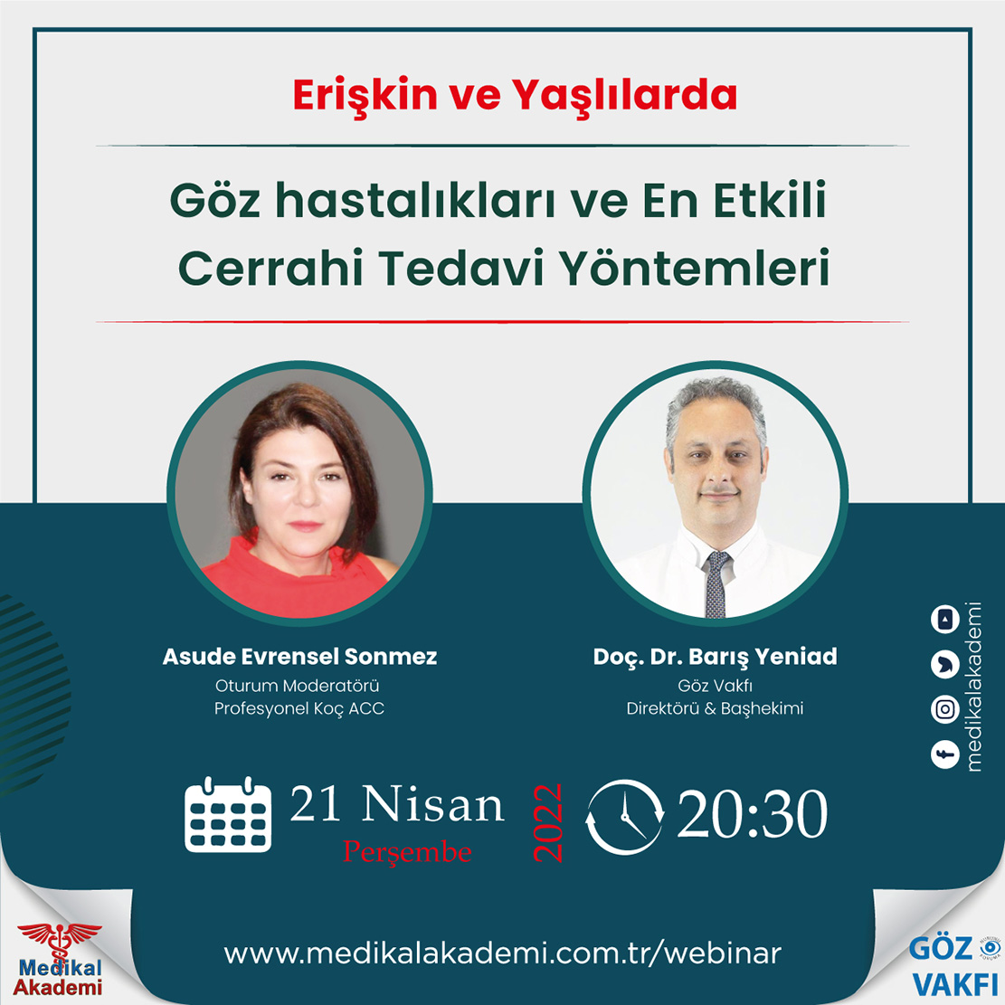 Medikal Akademi ve Göz Vakfı işbirliği ile düzenlenen ‘Erişkin ve Yaşlılarda Göz hastalıkları ve En Etkili Cerrahi Tedavi Yöntemleri’ konulu canlı söyleşimizde sorunun pek çok boyutunu konuşacağız. Göz Vakfı Direktör ve Başhekimi Doç. Dr. Barış Yeniad, konu ile ilgili Asude Evrensel Sonmez moderatörlüğünde konuşacağız. Yayınımızın sonunda izleyici sorularına yer verilecektir. Sorularınızı şimdiden yorum bölümümüze yazabilirsiniz. Kayıt butonu ile kayıt yaptırabilir ve yayın öncesinde hatırlatma maili alabilirsiniz. Youtube kanalımıza abone olarak sonraki webinar ve canlı yayınlarımızdan haberdar olabilirsiniz.