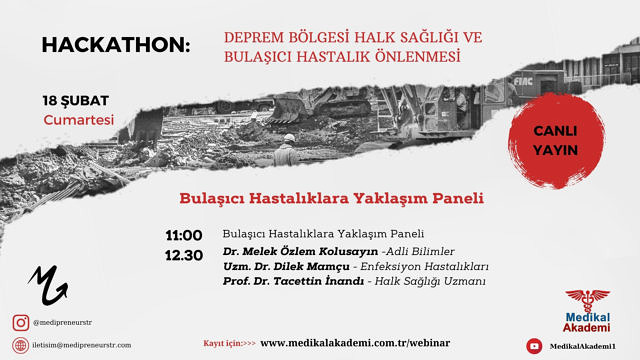Deprem nedeniyle İstanbul Bilgiyi Ticarileştirme Merkezi’nde düzenlenecek olan Deprem Bölgesi Halk Sağlığı ve Bulaşıcı Hastalıkların Önlenmesi Hackathon‘unu web sitemizden ve tüm sosyal medya hesaplarımızdan calı olarak yayınlayacağız. Hackathon’un 2. oturumunun başlığı ‘Bulaşıcı Hastalıklara Yaklaşım Paneli‘ olacak. Bu oturumun konuşmacılar şöyle: Adli Bilimler Uzmanı Dr. Melek Özlem Kolusayın, Enfeksiyon Hastalıkları Uzmanı Dr. Dilek Mamçu ve Halk Sağlığı Uzmanı Prof. Dr. Tacettin İnandı