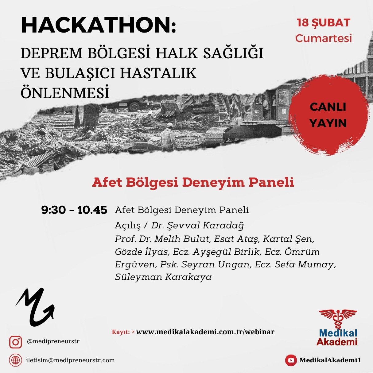Deprem nedeniyle İstanbul Bilgiyi Ticarileştirme Merkezi’nde düzenlenecek olan Deprem Bölgesi Halk Sağlığı ve Bulaşıcı Hastalıkların Önlenmesi Hackathon‘unu web sitemizden ve tüm sosyal medya hesaplarımızdan calı olarak yayınlayacağız. Açılış ve sunumunu Dr. Şevval Karadağ’ın yapacağı Hackathon’un ilk oturumundaki konuşmacılar şöyle: Prof. Dr. Melih Bulut, Esat Ataş, Kartal Şen, Gözde İlyas, Ecz. Ayşegül Birlik, Ecz. Ömrüm Ergüven, Psk. Seyran Ungan, Ecz. Sefa Mumay, Süleyman Karakaya.