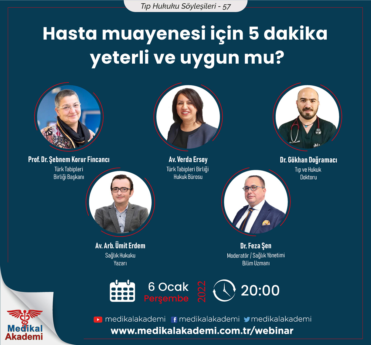 Tıp Hukuku Söyleşimizin 57’inci oturumunda “Hasta muayenesi için 5 dakika yeterli ve uygun mu?” konusunu, Türk Tabipleri Birliği Başkanı Prof. Dr. Şebnem Korur Fincancı, Türk Tabipleri Birliği Hukuk Bürosu’ndan Av. Verda Ersoy, Sağlık Hukuku Yazarı Av. Arb. Ümit Erdem, Sağlık Hukuku Bilim Uzmanı Dr. Yakup Gökhan Doğramacı, ile Sağlık Yönetim Uzmanı Dr. Feza Şen moderatörlüğünde konuştuk. Youtube kanalımıza abone olarak sonraki webinar ve canlı yayınlarımızdan haberdar olabilirsiniz.