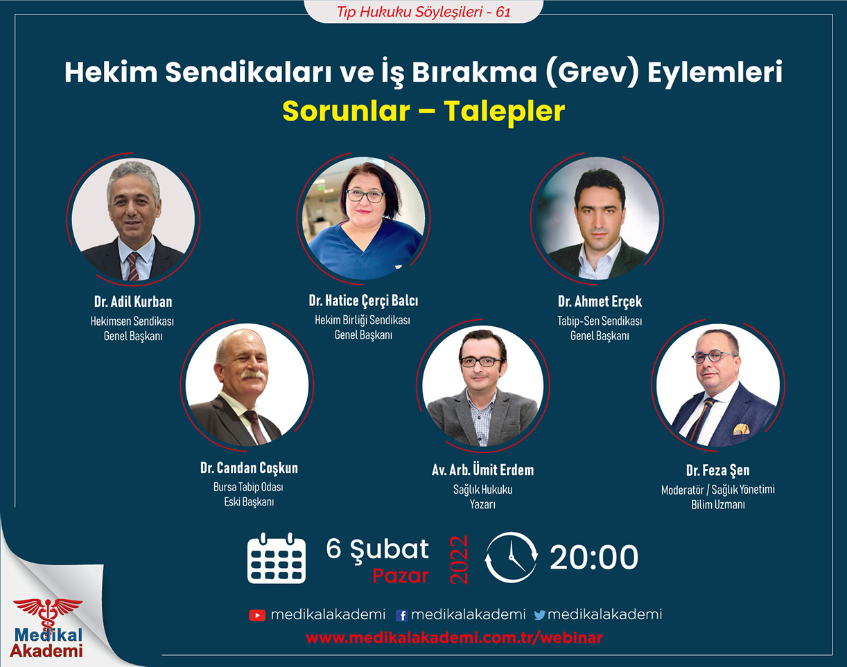 Tıp Hukuku Söyleşimizin 61’inci oturumunda “Hekim Sendikaları ve İş Bırakma (Grev) Eylemleri / Sorunlar & Talepler” konusunu, Bursa Tabip Odası Eski Başkanı Dr. Candan Coşkun, Hekimsen Sendikası Genel Başkanı Dr. Adil Kurban, Hekim Birliği Sendikası Genel Başkanı Dr. Hatice Çerçi Balcı, Tabip-Sen Sendikası Genel Başkanı Dr. Ahmet Erçek, Sağlık Hukuku Yazarı Av. Arb. Ümit Erdem, ile Sağlık Yönetim Uzmanı Dr. Feza Şen moderatörlüğünde konuştuk. Youtube kanalımıza abone olarak webinar ve yayınlarımızdan haberdar olabilirsiniz.