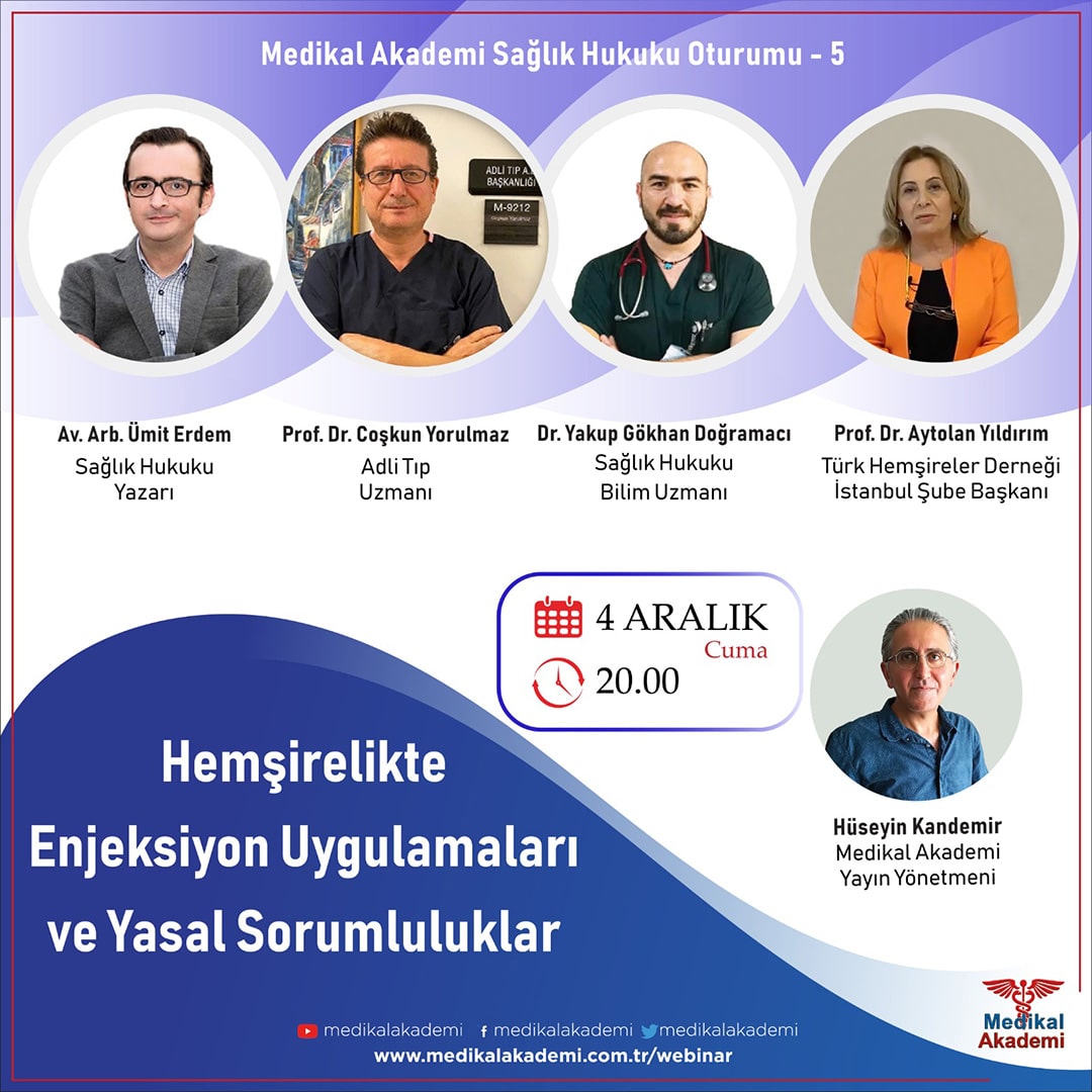 Medikal Akademi 5. Sağlık Hukuku Oturumu’nda ”Hemşirelikte Enjeksiyon Uygulamaları ve Yasal Sorumluluklar” konusunu tartıştık. Etkinliğimize dört değerli konuğumuz katıldı: Adli Tıp Uzmanı Prof. Dr. Coşkun Yorulmaz, Sağlık Hukuku Yazarı Av. Arb. Ümit Erdem, Sağlık Hukuku Bilimi Uzmanı Dr. Yakup Gökhan Doğramacı ve Türk Hemşireler Derneği İstanbul Şube Başkanı Prof. Dr. Aytolan Yıldırım. Söyleşimizde ayrıca ”Enjeksiyon uygulamalarında aydınlatılmış onam”’ gibi pek çok ilişkili konuyu da ele aldık. Youtube kanalımıza abone olarak sonraki yayınlardan haberdar olabilirsiniz.