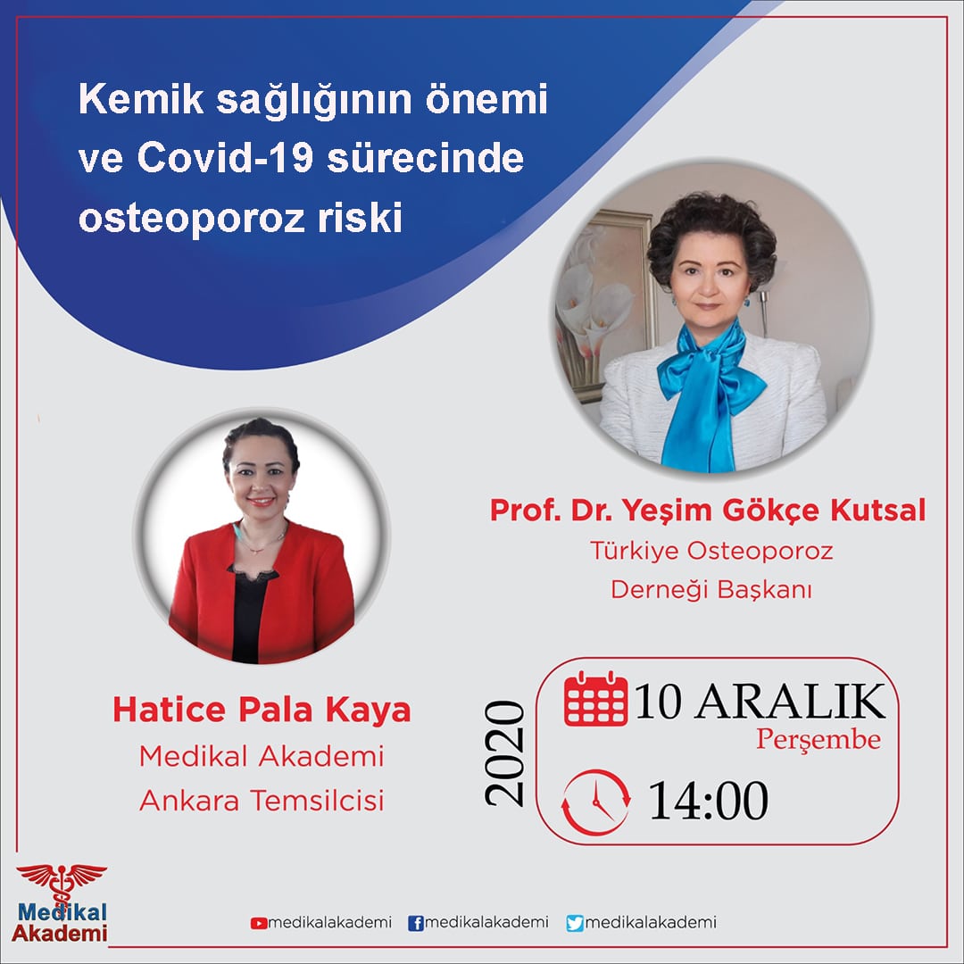 Medikal Akademi “Güncel Sağlık” söyleşilerinin bu bölümünde ”Kemik sağlığının önemi ve Covid-19 sürecinde osteoporoz riski” konusunda Hacettepe Üniversitesi Tıp Fakültesi Fiziksel Tıp ve Rehabilitasyon Anabilim Dalı Öğretim Üyesi ve Türkiye Osteoporoz Derneği Başkanı Prof. Dr. Yeşim Gökçe Kutsal, Medikal Akademi Ankara Temsilcisi Hatice Pala Kaya‘nın sorularını yanıtladı. Youtube kanalımıza abone olarak sonraki yayınlardan haberdar olabilirsiniz.