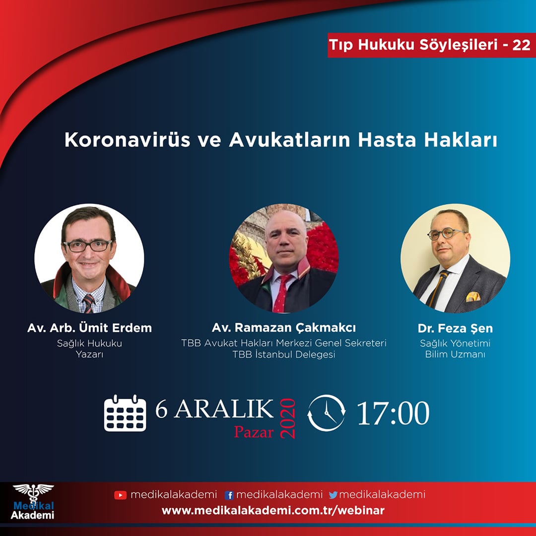 Medikal Akademi Tıp Hukuku Söyleşilerinin 22’nci buluşmasında ‘Koronavirüs Pandemisi ve Avukatların Hasta Hakları’ konusunu pek çok boyutunu konuştuk. Etkinliğimize Sağlık Hukuku Yazarı Av. Arb. Ümit Erdem, TBB Avukat Hakları Merkezi Genel Sekreteri Av. Ramazan Çakmakcı ve Sağlık Yönetimi Bilim Uzmanı Dr. Feza Şen katıldı. Yayınımızı kaçırmak istemiyorsanız Youtube kanalımıza abone olarak haberdar olabilirsiniz.