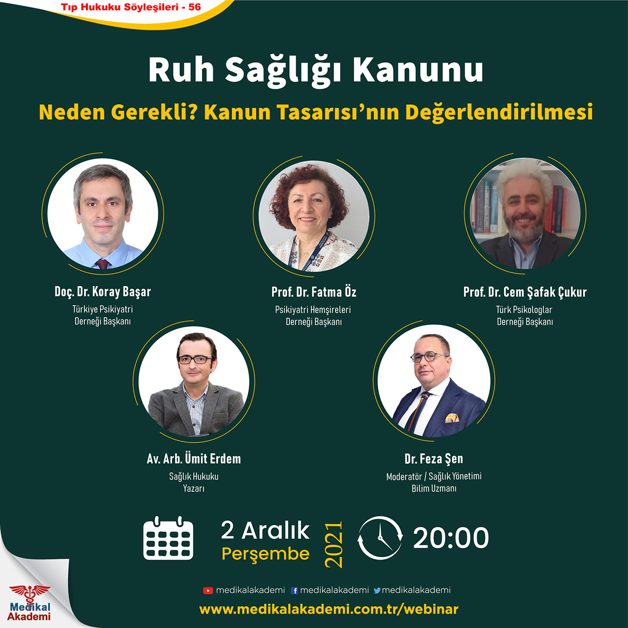 Tıp Hukuku Söyleşimizin 56’ıncı oturumunda “Ruh Sağlığı Kanunu: Neden Gerekli? Kanun Tasarısı’nın Değerlendirilmesi” konusunu, Türkiye Psikiyatri Derneği Başkanı Doç. Dr. Koray Başar, Psikiyatri Hemşireleri Derneği Başkanı Prof. Dr. Fatma Öz, Türk Psikologlar Derneği Başkanı Prof. Dr. Cem Şafak Çukur, Sağlık Hukuku Yazarı Av. Arb. Ümit Erdem ile Dr. Feza Şen moderatörlüğünde konuştuk. Youtube kanalımıza abone olarak sonraki webinar ve canlı yayınlarımızdan haberdar olabilirsiniz.