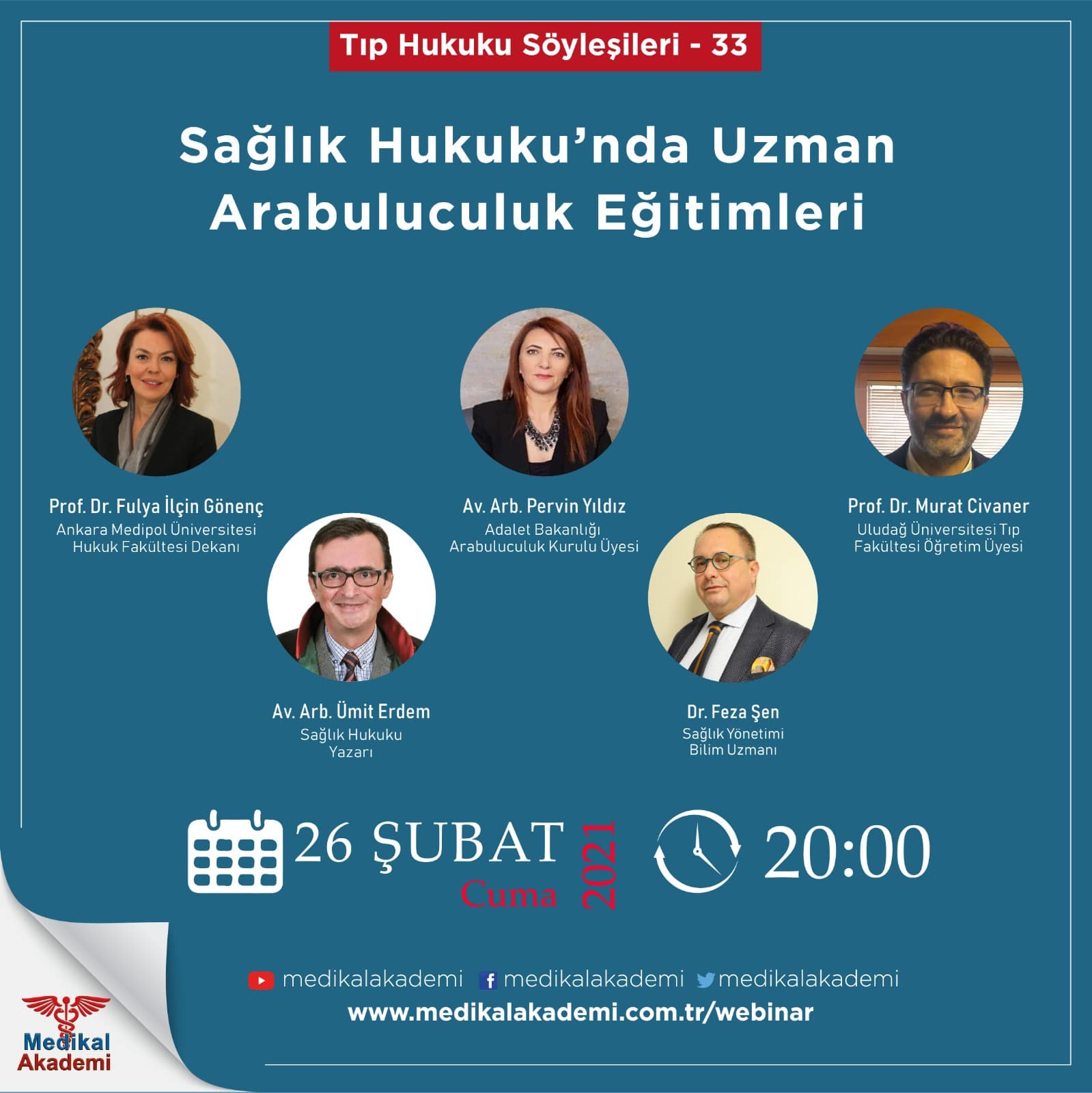 Medikal Akademi Tıp Hukuku Söyleşileri’nin 33’ücüncüsünde “Sağlık Hukuku’nda Uzman Arabuluculuk Eğitimleri” konusunu, Ankara Medipol Üniversitesi Hukuk Fakültesi Dekanı Prof. Dr. Fulya İlçin Gönenç, Adalet Bakanlığı Arabuluculuk Kurulu Üyesi Av. Arb. Pervin Yıldız, Uludağ Üniversitesi Tıp Fakültesi Öğretim Üyesi Prof. Dr. Murat Civaner ve Sağlık Hukuku Yazarı Av. Arb. Ümit Erdem ile Dr. Feza Şen moderatörlüğünde konuştuk. Youtube kanalımıza abone olarak sonraki etkinliklerden haberdar olabilirsiniz.