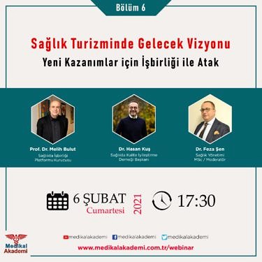 Medikal Akademi Sağlık Gündemi Programımızın altıncı bölümünde ‘Sağlık turizminde Gelecek Vizyonu: Yeni kazanımlar için İşbirliği ile Atak’ konusunda yaşanan önemli gelişmeleri Sağlıkta İşbirliği Platformu Kurucusu Prof. Dr. Melih Bulut ve Sağlıkta Kalite İyileştirme Derneği Başkanı Dr. Hasan Kuş ile Sağlık Yönetimi Bilim Uzmanı Dr. Feza Şen moderatörlüğünde konuştuk. Youtube kanalımıza abone olarak sonraki yayınlarımızdan haberdar olabilirsiniz.