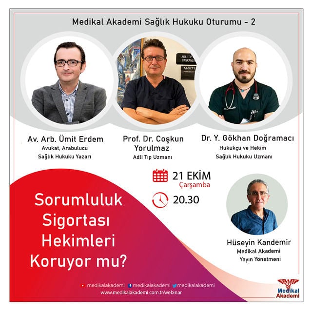 Medikal Akademi Sağlık Hukuku Oturumları devam ediyor. Yeni etkinliğimizde ”Sorumluluk Sigortası Hekimleri Koruyor mu?” sorusuna yanıt aradık. Bu etkinliğimize üç değerli konuğumuz katıldı: Adli Bilimler Uzmanı Prof. Dr. Çoşkun Yorulmaz, Sağlık Hukuku Uzmanı Av. Arb. Ümit Erdem ile Hukukçu & Hekim ve Sağlık Hukuku Uzmanı Dr. Yakup Gökhan Doğramacı. Söyleşimzde ayrıca Tıbbi Uygulama Hataları için kullanılan tıbbi mesuliyet sigortalarının teminatı yeterli mi? gibi pek çok ilişkili konuyu da ele aldık. Youtube kanalımıza abone olarak sonraki yayınlardan haberdar olabilirsiniz.Yayınlarımızı web sitemizden www.medikalakademi.com.tr/webinar sayfasından ve aşağıdaki sosyal medya hesaplarımızdan takip edebilirsiniz: